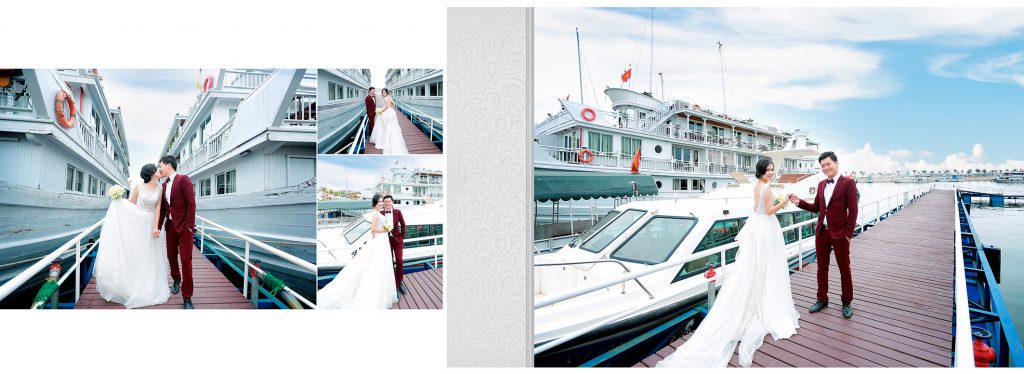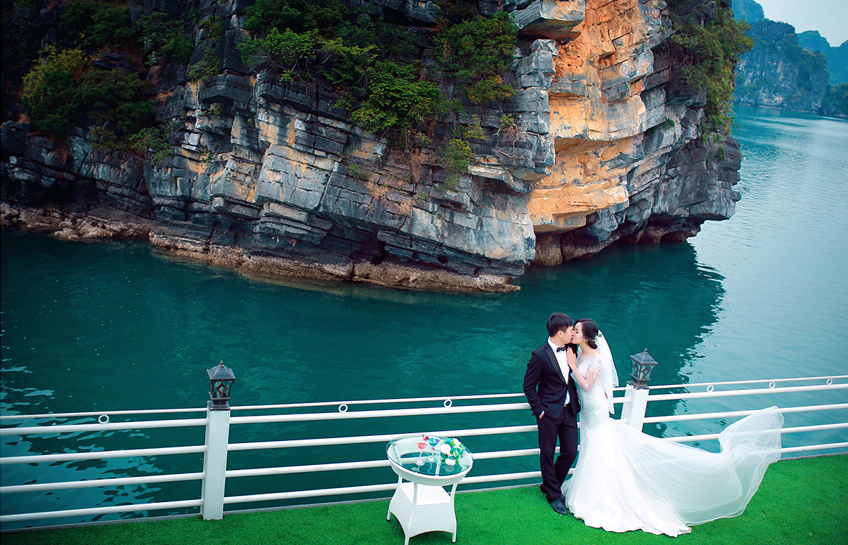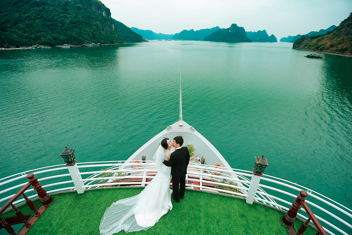 They have been colleagues for five years and have grown to know each other intimately. Their love blossomed over time, and they ultimately chose Halong Bay as the setting for their special day, as it holds a significant place in their hearts as the location where they first met and fell in love